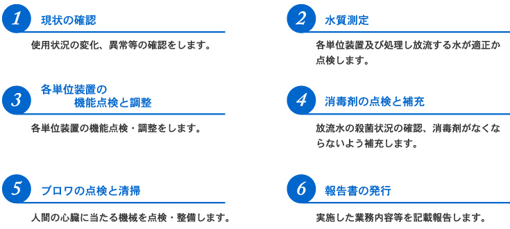浄化槽の色々な装置が正しく働いているか点検し、装置や機械の調整・修理、汚泥やスカムの状況を確認し、汚泥の引き抜きや清掃時期の判断、消毒剤の補充といったことを行います。